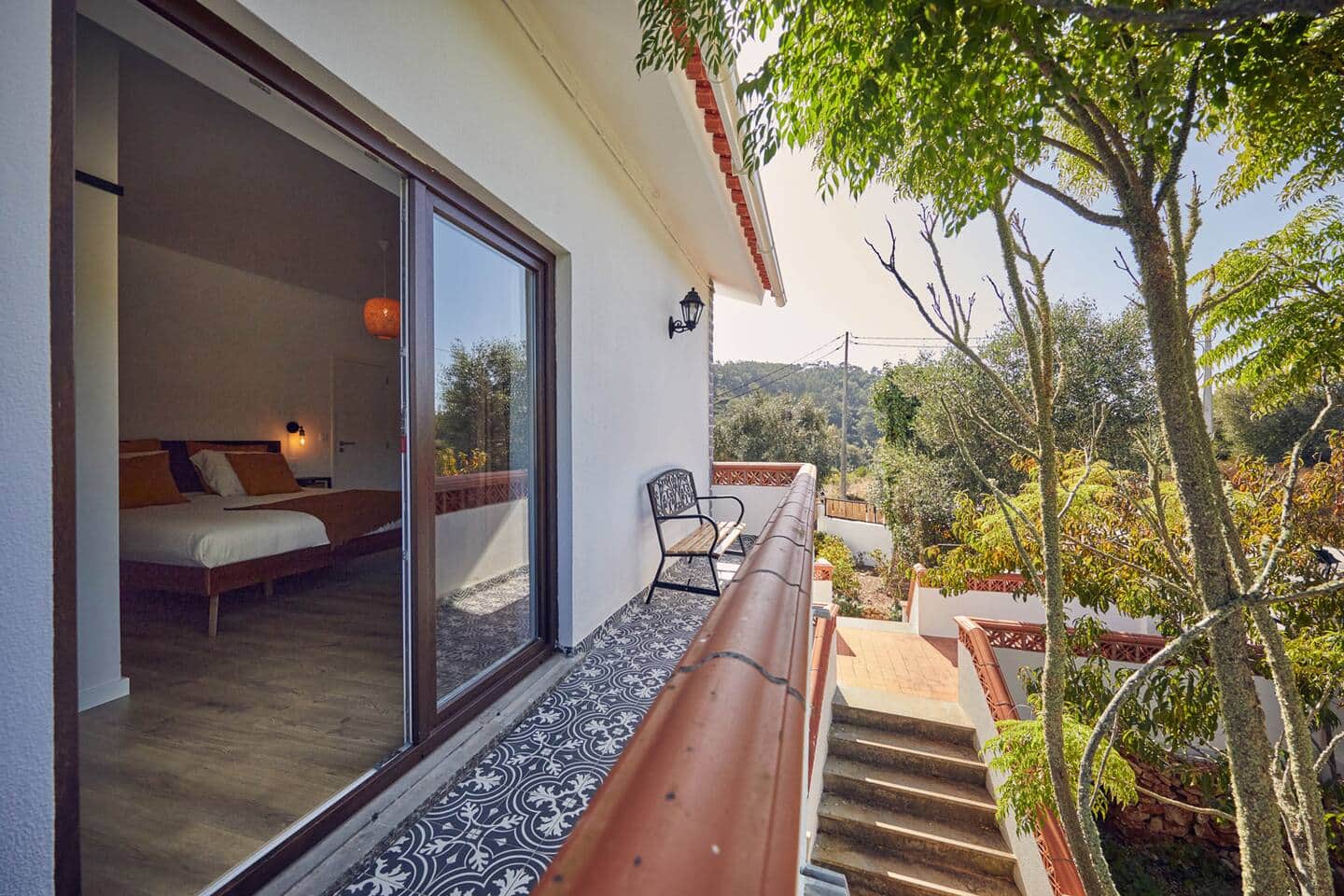 The private en-suite bathroom is equipped with both a refreshing rainfall shower and a handheld shower. An open wardrobe provides space for your clothes and luggage, and a desk to get some work done. Two elegant French doors fill the room with natural light and lead directly onto your own Portuguese-style balcony, where a wooden bench invites you to linger over morning coffee or to savor the breathtaking colors of the sunset.